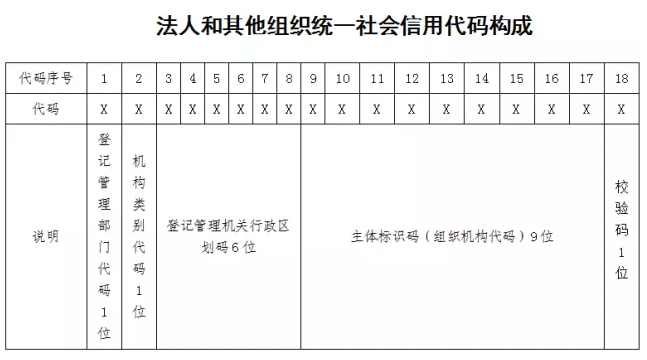 A:法人和其他組織統(tǒng)一社會(huì)信用代碼,是每一個(gè)法人和其他組織在全國(guó)范圍內(nèi)唯一的、終身不變的法定身份識(shí)別碼。每個(gè)統(tǒng)一社會(huì)信用代碼共18位,由五部分構(gòu)成,其中:登記管理部門代碼1位,機(jī)構(gòu)類別代碼1位,登記管理機(jī)關(guān)行政區(qū)劃碼6位,主體標(biāo)識(shí)碼(組織機(jī)構(gòu)代碼)9位,校驗(yàn)碼1位。